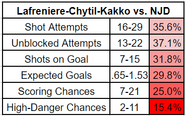 2) On our preview podcast the other day, we mentioned the Lafreniere-Chytil-Kakko line and what they can do in terms of long-shifting/possession. That may be true over the long 82 by mixing in a lot of bad NHL teams, but I don’t fear them against NJ’s defense. Very small sample, but here’s what they did vs. NJ in ~22 5-on-5 minutes: